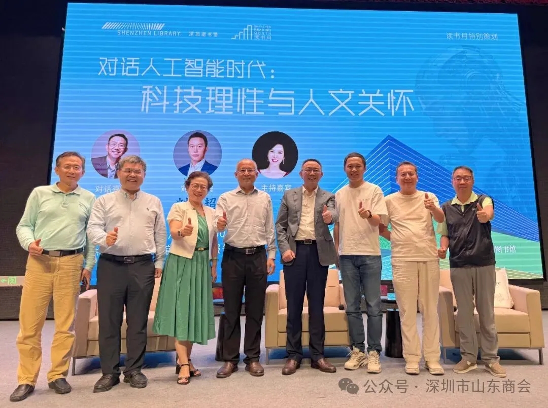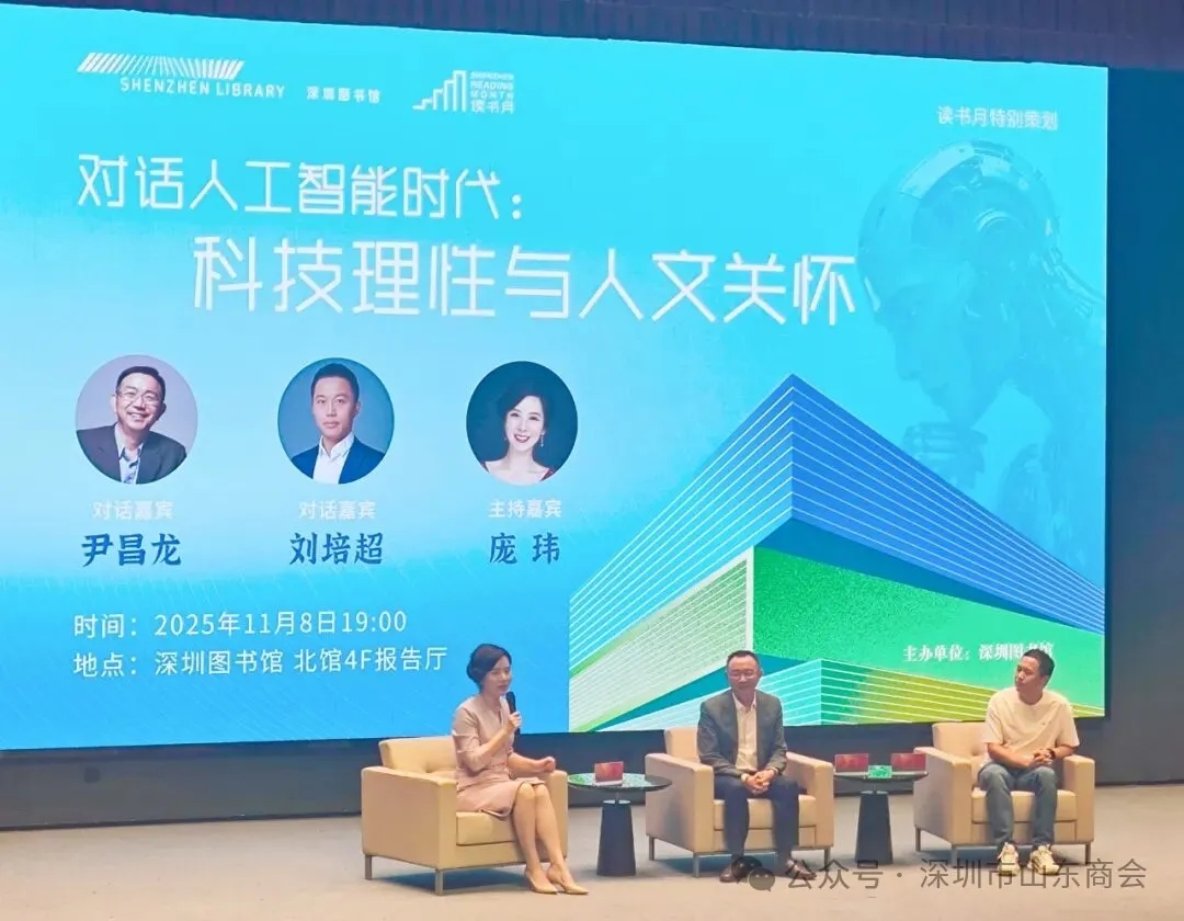 金秋鹏城,书香满城。2025年11月8日,在一年一度的深圳“读书月”之际,深圳市图书馆特别邀请著名人文学者(山大知名校友尹昌龙)与科技龙头企业掌门人(山东商会副会长、越疆科技创始人、董事长兼CEO刘培超)走进深圳图书馆,为大家展开面向未来的人文对话。我会会长王立新带队参加了此次分享会。