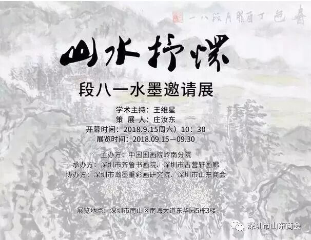 9月15日上午10:30,由中国国画院岭南分院主办,深圳市齐鲁书画院、深圳市古营轩画廊承办,深圳市瀚墨重彩画研究院、深圳市山东商会协办的“山水抒怀——段八一水墨邀请展”于深圳市东华园古营轩画廊隆重开幕。
